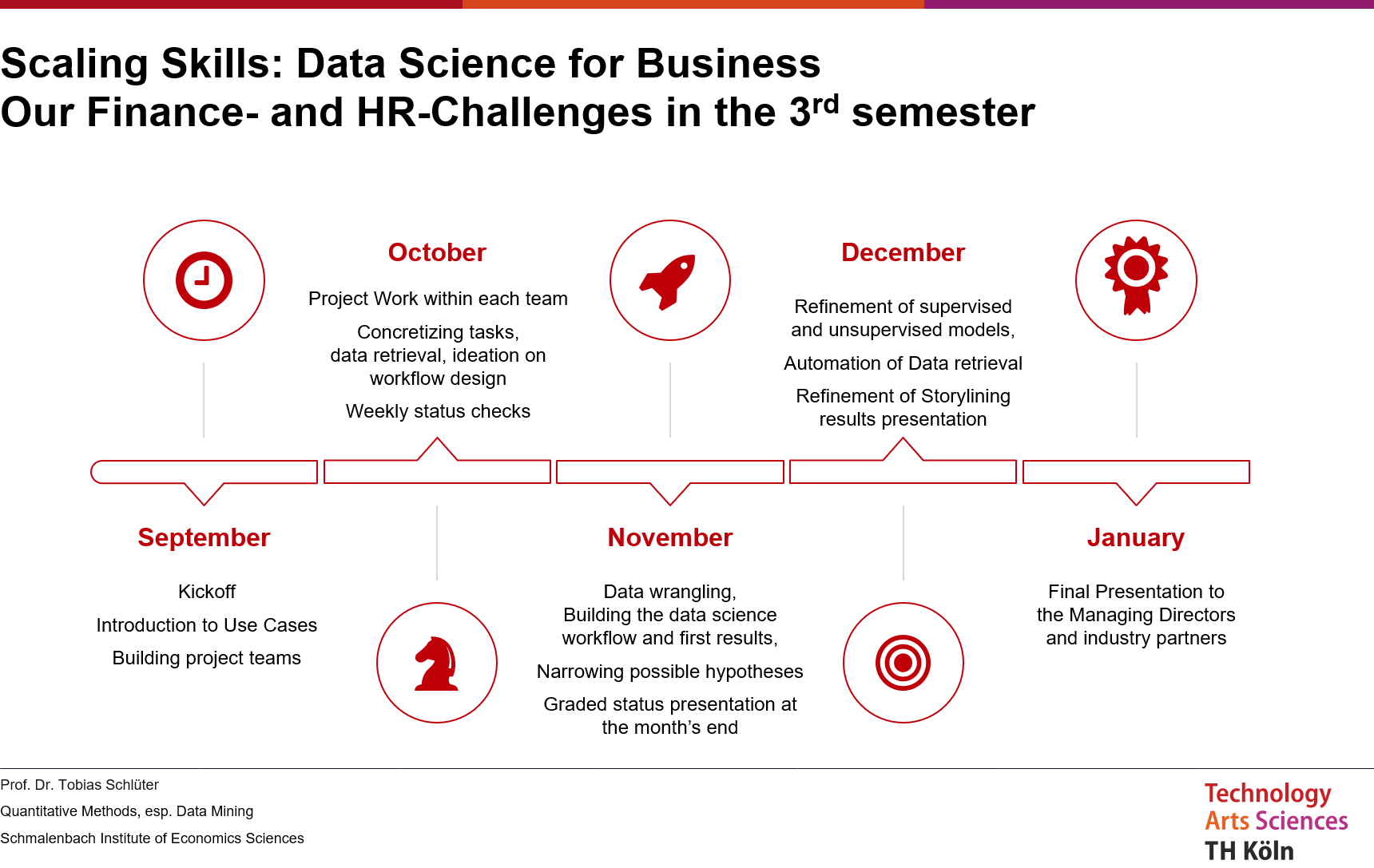 A crucial goal of my teaching is to scale my students’ analytical skills in real-world projects. In project-based followup courses with industry partners, students learn to deal with real use cases, work with messy datasets, and decide which approaches work best with various problems. Let's take a look at our data science challenges at TH Köln.